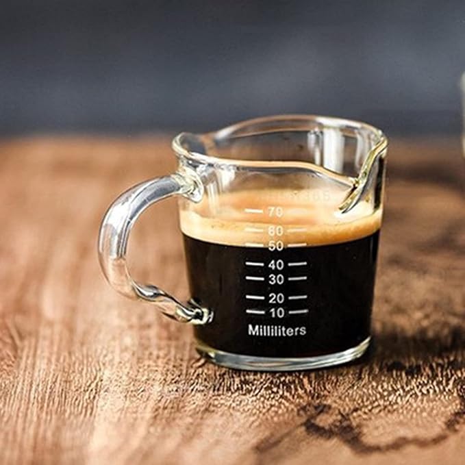 Szklanka wyposażona jest w czytelną podziałkę w mililitrach i uncjach, co pozwala dokładnie kontrolować ilość espresso – zarówno przy pojedynczym, jak i podwójnym shocie. Dzięki temu idealnie sprawdza się podczas ustawiania młynka (dial-in) oraz testowania parametrów parzenia.