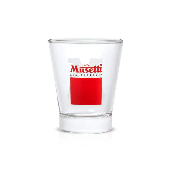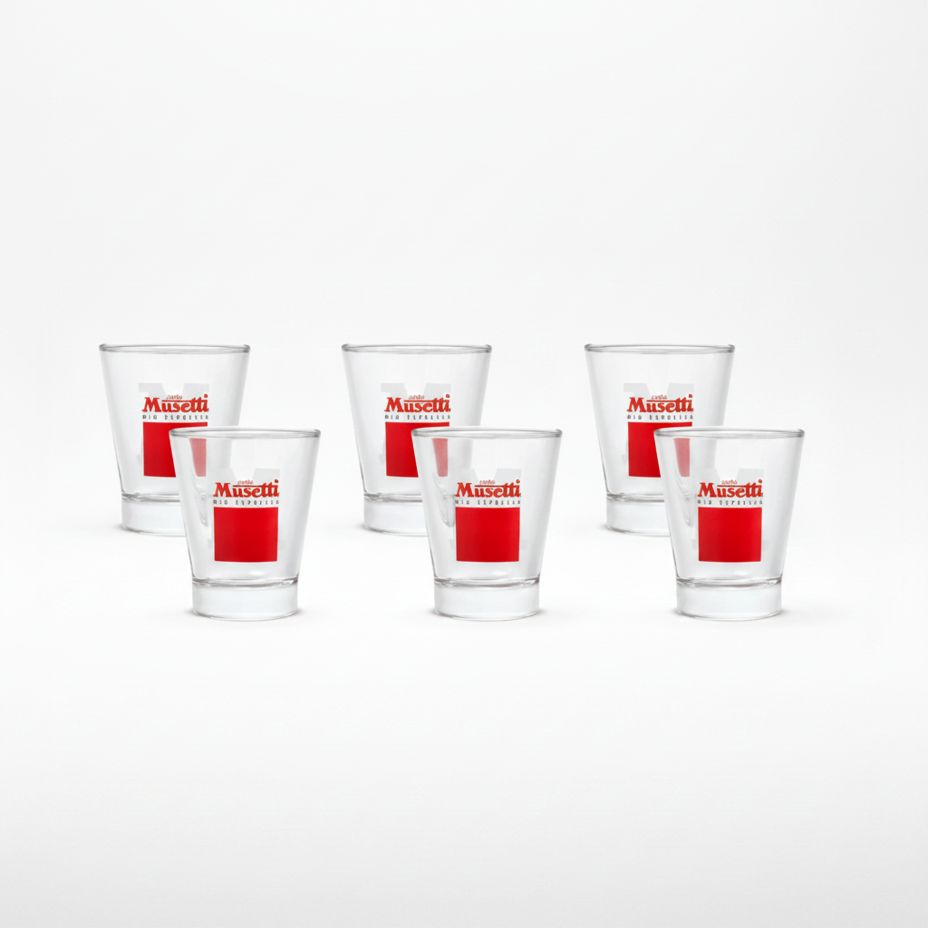 Zestaw 6sztuk szklanych filiżanek z logo Musetti, idealne do crema di caffe i kaw smakowych.