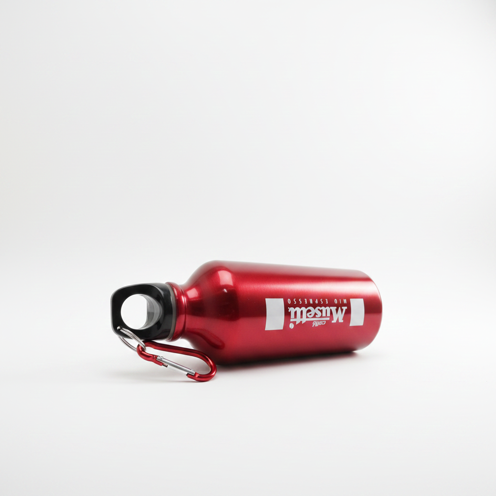 Butelka na wodę czerwona z logo Musetti - uchwyt karabińczyk, zakręcane wieczko.