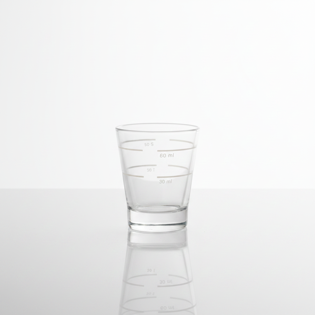 Szklanka wyposażona jest w czytelną podziałkę obejmującą poziomy 30 ml i 60 ml, co pozwala łatwo kontrolować ilość ristretto, pojedynczego oraz podwójnego espresso. Dzięki temu świetnie sprawdza się podczas ustawiania młynka (dial-in) oraz testowania parametrów parzenia.