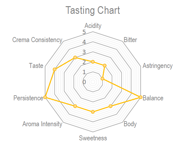 Jako mieszanka ziaren Arabica i możliwej niewielkiej ilości Robusty (szczegóły producenta nie są jawne), kawa ma umiarkowaną zawartość kofeiny – zapewnia energię bez nadmiernej goryczy.