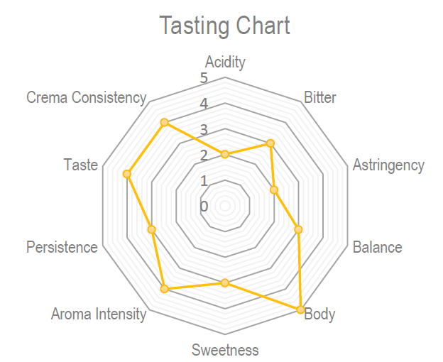 Kawa Varesina Plata charakteryzuje się pełnym, zdecydowanym smakiem z wyraźnymi nutami kakao, czekolady i delikatną kwasowością na początku, która przechodzi w bogaty, aromatyczny finisz.