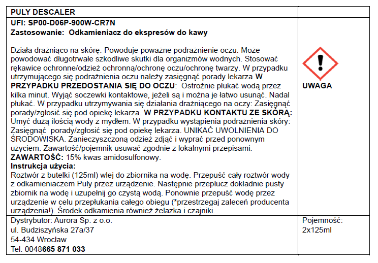 Instrukcja użycia: Roztwór z butelki (125ml) wlej do zbiornika na wodę. Przepuść cały roztwór wody z odkamieniaczem Puly przez urządzenie. Następnie przepłucz dokładnie pusty zbiornik na wodę i uzupełnij go czystą wodą. Ponownie przepuść wodę przez urządzenie w celu przepłukania całego obiegu (*przestrzegaj zaleceń producenta urządzenia!). Środek odkamienia również żelazka i czajniki.